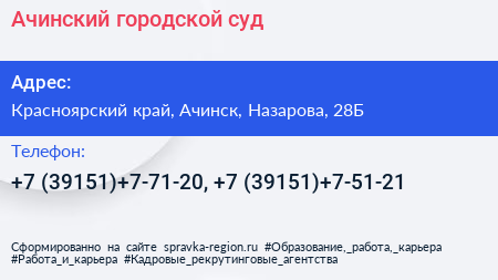 Ачинский городской суд по адресу Красноярский край, Ачинск, Назарова, 28Б в дальнейшем Организация, размещена в следующих категориях:
