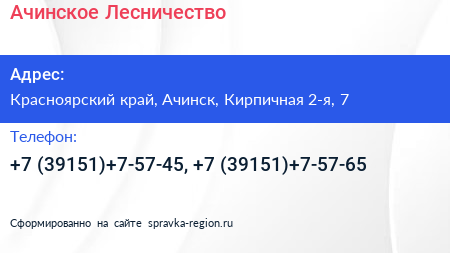Ачинское Лесничество по адресу Красноярский край, Ачинск, Кирпичная 2-я, 7 в дальнейшем Организация, размещена в следующих категориях:
