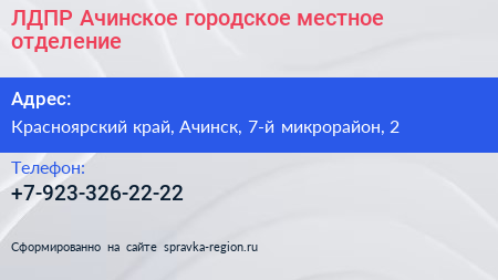 ЛДПР, Ачинское городское местное отделение по адресу Красноярский край, Ачинск, 7-й микрорайон, 2 в дальнейшем Организация, размещена в следующих категориях: