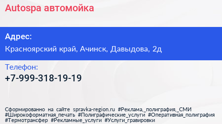 Autospa, автомойка по адресу Красноярский край, Ачинск, Давыдова, 2д в дальнейшем Организация, размещена в следующих категориях: