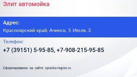 Элит, автомойка по адресу Красноярский край, Ачинск, 5 Июля, 3 в дальнейшем Организация, размещена в следующих категориях: