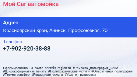 Мой Car, автомойка по адресу Красноярский край, Ачинск, Профсоюзная, 70 в дальнейшем Организация, размещена в следующих категориях: