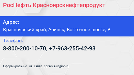 РосНефть-Красноярскнефтепродукт по адресу Красноярский край, Ачинск, Восточное шоссе, 9 в дальнейшем Организация, размещена в следующих категориях: