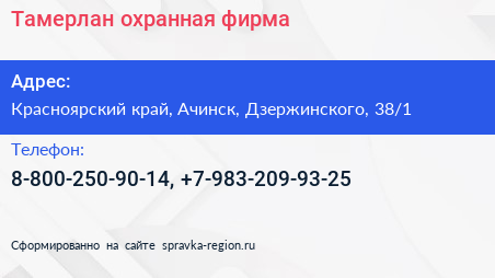 Тамерлан, охранная фирма по адресу Красноярский край, Ачинск, Дзержинского, 38/1 в дальнейшем Организация, размещена в следующих категориях: