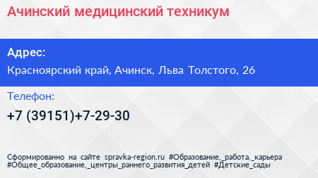 Ачинский медицинский техникум по адресу Красноярский край, Ачинск, Льва Толстого, 26 в дальнейшем Организация, размещена в следующих категориях: