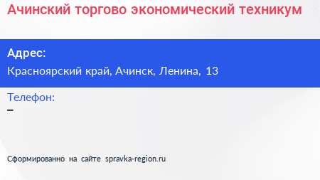 Ачинский торгово-экономический техникум по адресу Красноярский край, Ачинск, Ленина, 13 в дальнейшем Организация, размещена в следующих категориях: