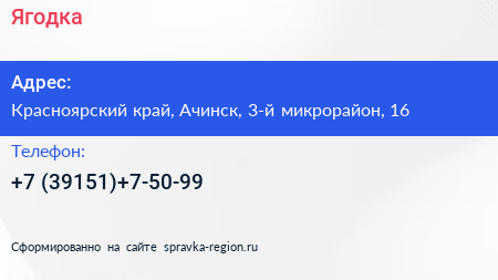 Ягодка по адресу Красноярский край, Ачинск, 3-й микрорайон, 16 в дальнейшем Организация, размещена в следующих категориях: