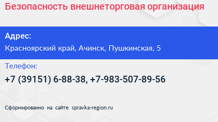 Безопасность, внешнеторговая организация по адресу Красноярский край, Ачинск, Пушкинская, 5 в дальнейшем Организация, размещена в следующих категориях: