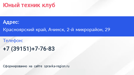 Юный техник, клуб по адресу Красноярский край, Ачинск, 2-й микрорайон, 29 в дальнейшем Организация, размещена в следующих категориях: