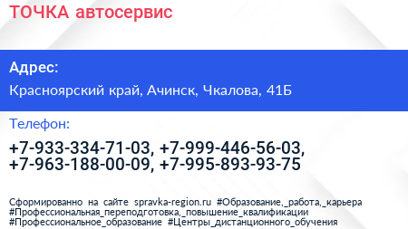ТОЧКА, автосервис по адресу Красноярский край, Ачинск, Чкалова, 41Б в дальнейшем Организация, размещена в следующих категориях: