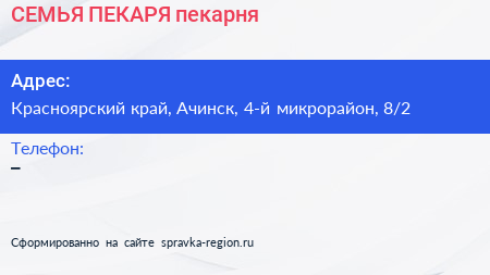 СЕМЬЯ ПЕКАРЯ, пекарня по адресу Красноярский край, Ачинск, 4-й микрорайон, 8/2 в дальнейшем Организация, размещена в следующих категориях: