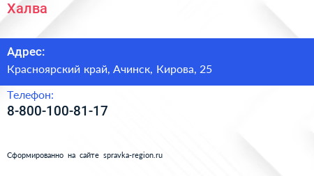 Халва по адресу Красноярский край, Ачинск, Кирова, 25 в дальнейшем Организация, размещена в следующих категориях:
