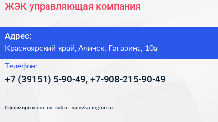 ЖЭК, управляющая компания по адресу Красноярский край, Ачинск, Гагарина, 10а в дальнейшем Организация, размещена в следующих категориях: