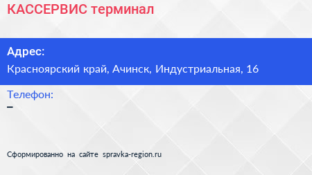 КАССЕРВИС, терминал по адресу Красноярский край, Ачинск, Индустриальная, 16 в дальнейшем Организация, размещена в следующих категориях: