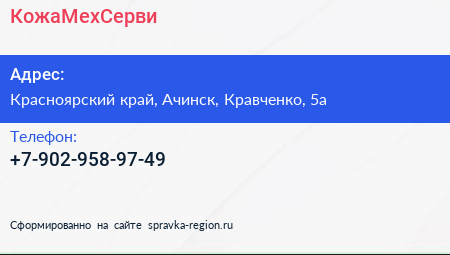 КожаМехСерви по адресу Красноярский край, Ачинск, Кравченко, 5а в дальнейшем Организация, размещена в следующих категориях: