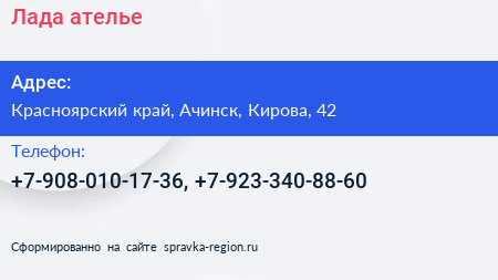 Лада, ателье по адресу Красноярский край, Ачинск, Кирова, 42 в дальнейшем Организация, размещена в следующих категориях: