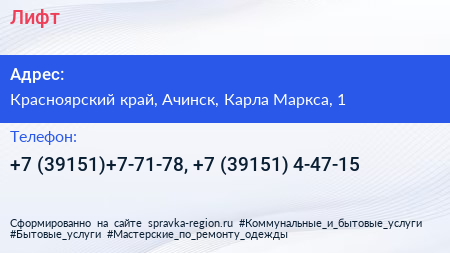 Лифт по адресу Красноярский край, Ачинск, Карла Маркса, 1 в дальнейшем Организация, размещена в следующих категориях: