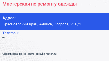 Мастерская по ремонту одежды по адресу Красноярский край, Ачинск, Зверева, 91Б/1 в дальнейшем Организация, размещена в следующих категориях: