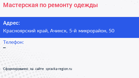 Мастерская по ремонту одежды по адресу Красноярский край, Ачинск, 5-й микрорайон, 50 в дальнейшем Организация, размещена в следующих категориях: