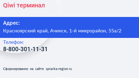 Qiwi, терминал по адресу Красноярский край, Ачинск, 1-й микрорайон, 55а/2 в дальнейшем Организация, размещена в следующих категориях: