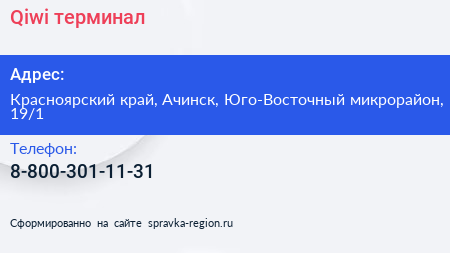 Qiwi, терминал по адресу Красноярский край, Ачинск, Юго-Восточный микрорайон, 19/1 в дальнейшем Организация, размещена в следующих категориях: