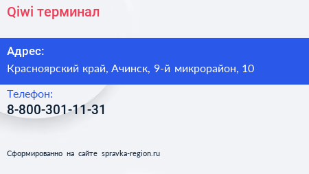 Qiwi, терминал по адресу Красноярский край, Ачинск, 9-й микрорайон, 10 в дальнейшем Организация, размещена в следующих категориях: