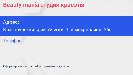 Beauty mania, студия красоты по адресу Красноярский край, Ачинск, 1-й микрорайон, 36г в дальнейшем Организация, размещена в следующих категориях: