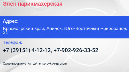Элен, парикмахерская по адресу Красноярский край, Ачинск, Юго-Восточный микрорайон, 31 в дальнейшем Организация, размещена в следующих категориях: