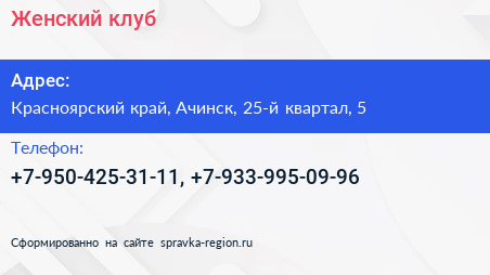 Женский клуб по адресу Красноярский край, Ачинск, 25-й квартал, 5 в дальнейшем Организация, размещена в следующих категориях: