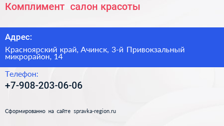 Комплимент+, салон красоты по адресу Красноярский край, Ачинск, 3-й Привокзальный микрорайон, 14 в дальнейшем Организация, размещена в следующих категориях: