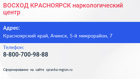 ВОСХОД-КРАСНОЯРСК, наркологический центр по адресу Красноярский край, Ачинск, 5-й микрорайон, 7 в дальнейшем Организация, размещена в следующих категориях: