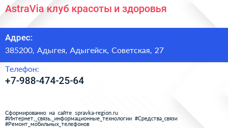 AstraVia, клуб красоты и здоровья по адресу 385200, Адыгея, Адыгейск, Советская, 27 в дальнейшем Организация, размещена в следующих категориях: