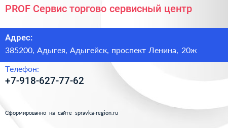 PROF Сервис, торгово-сервисный центр по адресу 385200, Адыгея, Адыгейск, проспект Ленина, 20ж в дальнейшем Организация, размещена в следующих категориях: