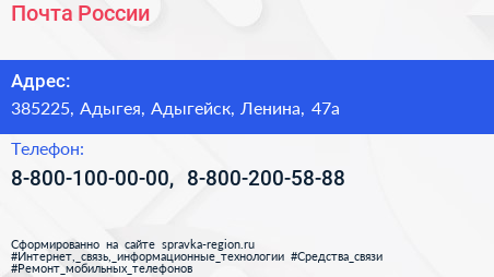 Почта России по адресу 385225, Адыгея, Адыгейск, Ленина, 47а в дальнейшем Организация, размещена в следующих категориях: