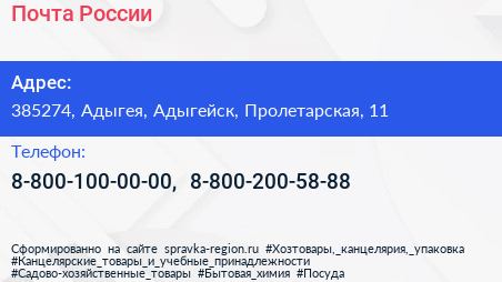 Почта России по адресу 385274, Адыгея, Адыгейск, Пролетарская, 11 в дальнейшем Организация, размещена в следующих категориях: