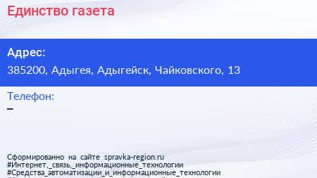 Единство, газета по адресу 385200, Адыгея, Адыгейск, Чайковского, 13 в дальнейшем Организация, размещена в следующих категориях: