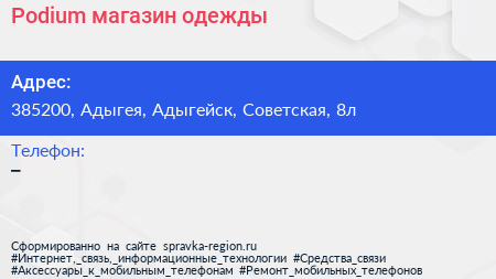 Podium, магазин одежды по адресу 385200, Адыгея, Адыгейск, Советская, 8л в дальнейшем Организация, размещена в следующих категориях: