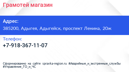 Грамотей, магазин по адресу 385200, Адыгея, Адыгейск, проспект Ленина, 20ж в дальнейшем Организация, размещена в следующих категориях: