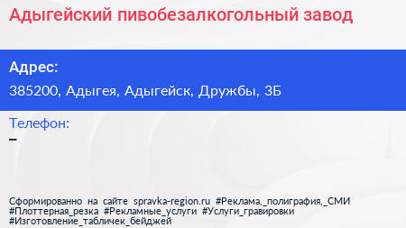 Адыгейский пивобезалкогольный завод по адресу 385200, Адыгея, Адыгейск, Дружбы, 3Б в дальнейшем Организация, размещена в следующих категориях: