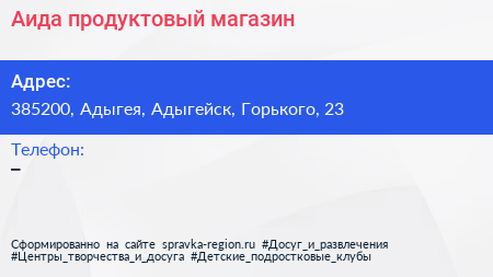 Аида, продуктовый магазин по адресу 385200, Адыгея, Адыгейск, Горького, 23 в дальнейшем Организация, размещена в следующих категориях: