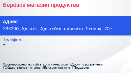 Берёзка, магазин продуктов по адресу 385200, Адыгея, Адыгейск, проспект Ленина, 20е в дальнейшем Организация, размещена в следующих категориях: