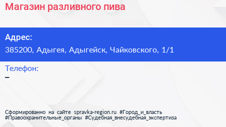 Магазин разливного пива по адресу 385200, Адыгея, Адыгейск, Чайковского, 1/1 в дальнейшем Организация, размещена в следующих категориях: