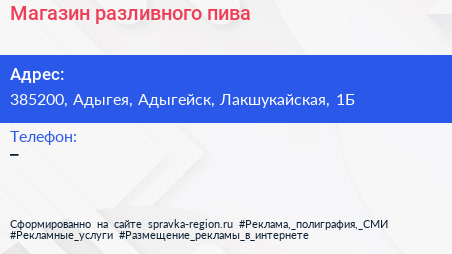 Магазин разливного пива по адресу 385200, Адыгея, Адыгейск, Лакшукайская, 1Б в дальнейшем Организация, размещена в следующих категориях: