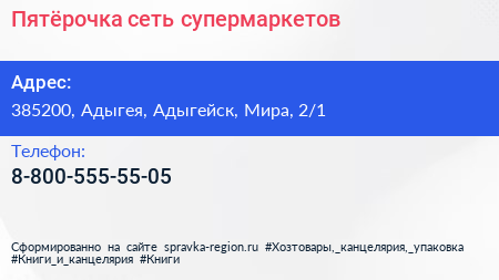 Пятёрочка, сеть супермаркетов по адресу 385200, Адыгея, Адыгейск, Мира, 2/1 в дальнейшем Организация, размещена в следующих категориях: