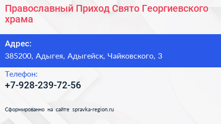 Православный Приход Свято-Георгиевского храма по адресу 385200, Адыгея, Адыгейск, Чайковского, 3 в дальнейшем Организация, размещена в следующих категориях: