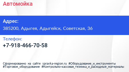 Автомойка по адресу 385200, Адыгея, Адыгейск, Советская, 36 в дальнейшем Организация, размещена в следующих категориях: