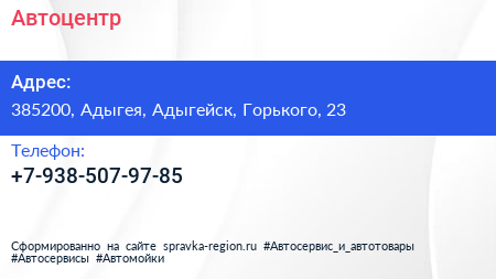 Автоцентр по адресу 385200, Адыгея, Адыгейск, Горького, 23 в дальнейшем Организация, размещена в следующих категориях: