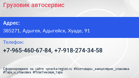 Грузовик, автосервис по адресу 385271, Адыгея, Адыгейск, Хуаде, 91 в дальнейшем Организация, размещена в следующих категориях:
