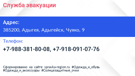 Служба эвакуации по адресу 385200, Адыгея, Адыгейск, Чуяко, 9 в дальнейшем Организация, размещена в следующих категориях: