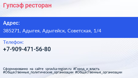 Гупсэф, ресторан по адресу 385271, Адыгея, Адыгейск, Советская, 1/4 в дальнейшем Организация, размещена в следующих категориях: